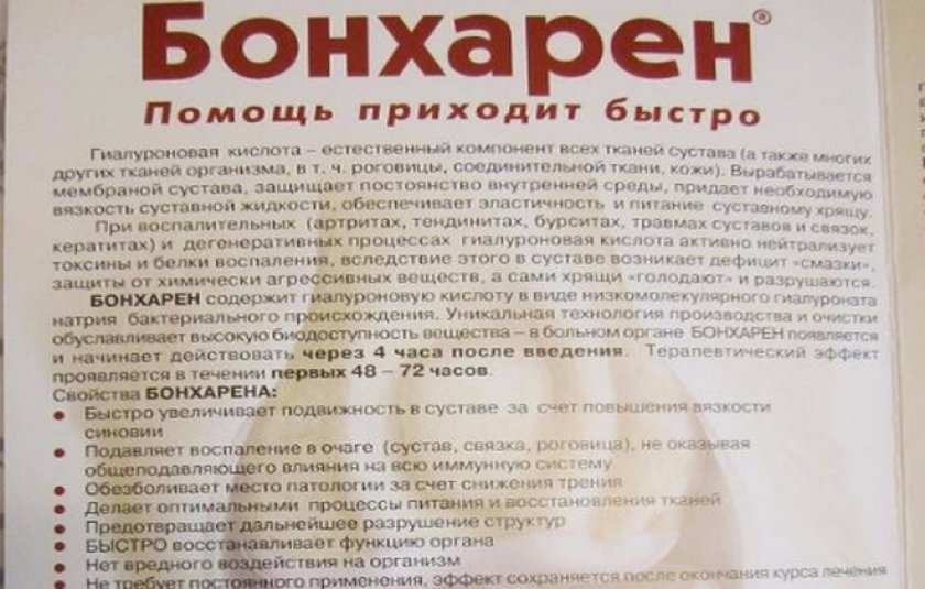 Препарат «Бонхарен» — офтальмологический, увлажняющий раствор естественного происхождения. Гиалуроновая кислота — органическое соединение, входящее в состав биологических жидкостей и тканей организма. Таким образом, за ее счет происходит и пополнение суставной жидкости.